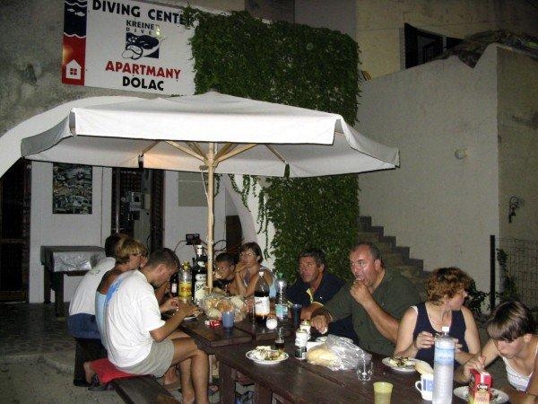 Ve čtyřlůžkových apartmánech v komplexu Dolac. Apartmány jsou vybaveny kuchyňkou, ledničkou, koupelnou s wc. V pokojích je povlečení i nádobí. V areálu se nachází volejbalové a petaqueové hřiště, tenisový kurt, klec na potápěčskou výstroj, prostor k omytí, stolky k posezení, kompresorovna.Parkoviště pro auta leží z druhé strany baráku. Celý dům se nachází asi 100m od moře. Zde na jednu stranu začínají betonové a oblázkové pláže s promenádou, na druhou je malý přístav odkud se vyjíždí na potápění a město.