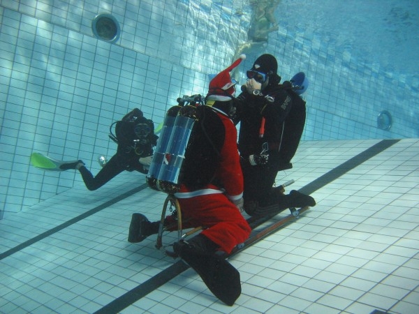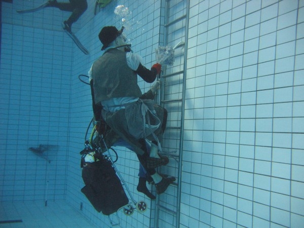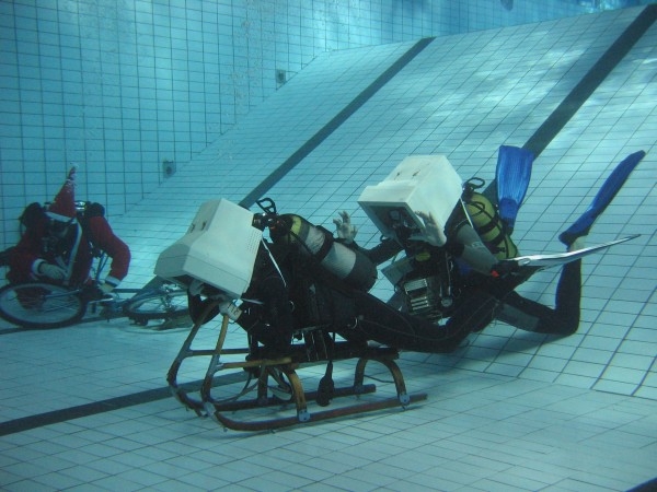 Za zmínku stojí discipína sjezdu na sáních ve dvojicích , která se jela ze dvou do pěti metrů bez brždění...A také další disciplíny, které jednotlivé masky zvládali různě, většinou úspěšně - neboť jak se 45 lidí zanořilo, tak se stejný počet i vynořil... Finální zkouška jízdy na kole pod vodou vypadá sice pohodově, ale zas tak jednoduše to nejde ani přítomným freediverům... Nakonec jsme na dně rozbalili koberec a pro uklidnění vykouřili šišu. Vše registovalo výpočetní středisko a několik dalších strašidel , dokonce i hokejista z NHL vyslýchaný členem STB z Lidových milicí.