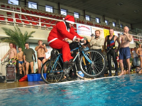 Úvodem musíme přiznat : Tak výborný začátek, jakým jsme vstoupili do letošního zápolení o hodnotné ceny i uznání kolegů ,mohl vymyslet pouze autor této myšlenky . Skok do bazénu se speciálně připraveným / a odmaštěným / bicyklem byl zážitkem i pro diváky okolo nás . A další a další překvapení následovala celé 2 hodiny, které jsme ve vodě strávili coby různé masky. A je jasné, že tentokrát nikomu zima nebyla, spíše naopak. Uvítací aperitiv na tom nemá žádou zásluhu , ale pouze a pouze bojovnost jednotlivců i dvojic. Následující soutěže si můžete vychutnat na připojených snímcích a případně i někdy s námi zopakovat , nebo si něco podobného připravit na letní sezonu. Dokáži si představit, jak nás někdo takto ,, vyšnořené ,, potká na stěně mezi BELLS a BLUE HOLE , někdy stačí i dobrý nápad...