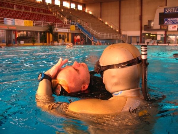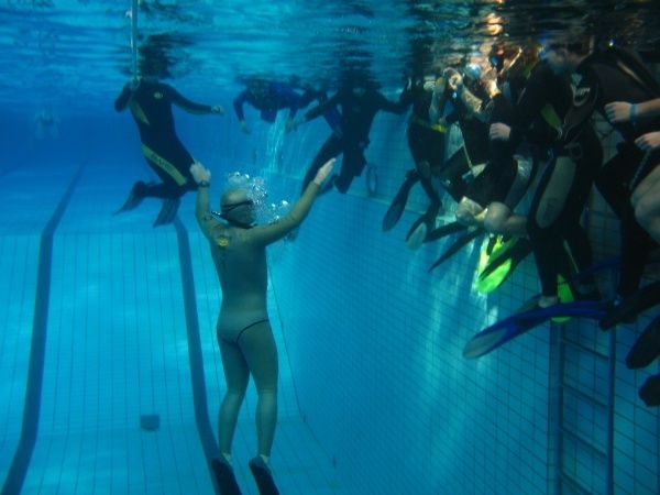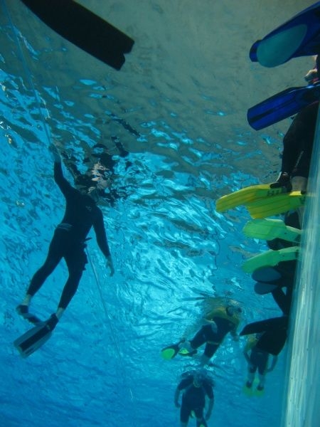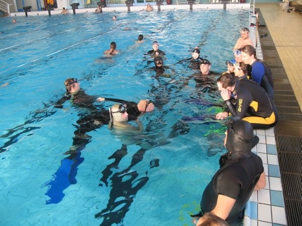 začnete v učebně, následuje však brzy první bazén, kde to všechno