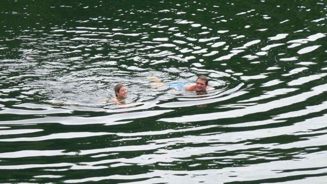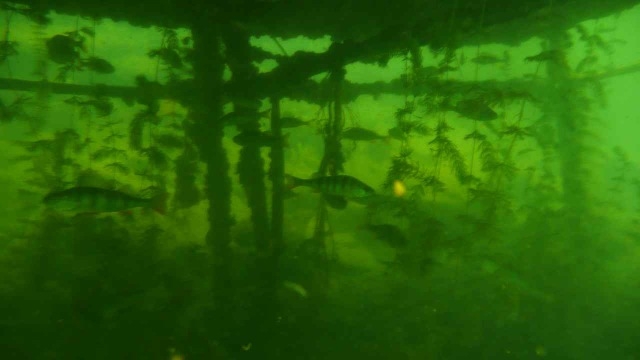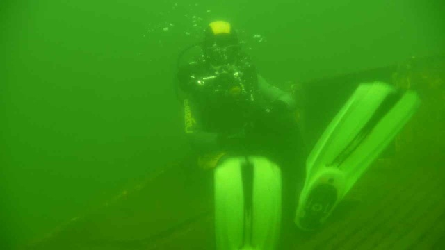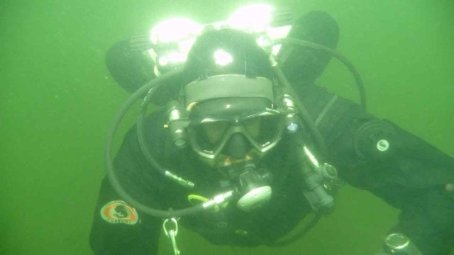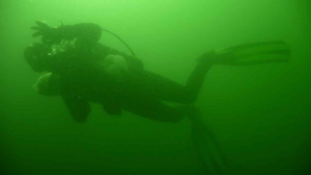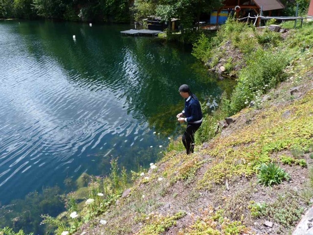 Mezi jednotlivými bójemi prováděli svůj výcvik naši tři noví potápěčtí adepti Terka, Tom a Jirka pod vedením Paldy. Mně se první ponor pravda moc nezdařil ,dohodli jsme se s baddym Vaškem že sestoupíme do 5 metrů, vyvážíme se a vyrazíme na průzkum místních atrakcí. Nevím proč, ale na pěti metrech jsem jaksi záhadně nemohl vyrovnat vztlak a po krátké zastávce na této hloubce jsem spadl někam až k desíti metrům. Tam se mi zadařilo opět začít stoupat do smluvené hloubky a po upuštění vzduchu z křídla, abych dále nestoupal jsem opět propadl k již oblíbeným desíti metrům a tak asi třikrát dokola . Na tento zvláštní tzv. oscilační začátek ponoru naštěstí skvěle a pohotově reagoval buddy Vašek a byl mi pořád na dohled. To zasluhuje při jeho mládí velkou pochvalu, protože když by neosciloval se mnou a čekal na mě ve smluvené hloubce už bychom se při dané špatné viditelnosti asi nesetkali a museli ukončit ponor. Po této peripetii nakonec ponor proběhl v pohodě ,po vyvázaných lanech jsme našli potopenou jachtu, loďku, plata a pod nimi hromadu okounů. Nesetkali jsme se však s největší místní atrakcí jíž jsou sumci rohlíkožraví (Silurus rohlikohamus). Voda byla jinak studená,zelená a opět se zpanikařil můj počítač, neboť ukazoval naprosté blbiny.