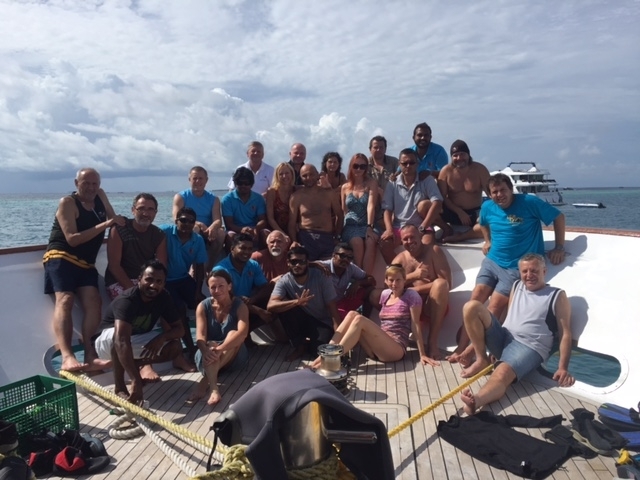 Nad ránem jsme se přesunuli na poslední potápěčské místo Lankan Faru, kde má být manta point. První ponor je v 7,31 hod. Klesneme za středního proudu a doplaveme k manta pointu v 16 metrech. Zahákneme se do půlkruhu a čekáme. Nad námi však dorazí jiná loď s potápěči, kteří jdou přímo k nám, takže manty nevidíme a vyrážíme s proudem. Za odměnu vidíme hned 2 žraloky a následně se objeví proti nám 2 manty a chvíli plavou ve volné vodě spolu s námi. Je to krása, dále vidíme velkého kanice, dalšího žraloka a mantu a spoustu dalších rybiček. Byl to krásný ponor, umocněný sluníčkem a dobrou viditelností. Druhý ponor, vlastně již úplně poslední z celého týdne, následuje v 10.35 na stejném místě, opět míříme na manta point. Někteří opozdilci přijíždí na ponor dinginou a navíc se chystá pod vodou pokus s vejcem a čtením časopisu Milošem. Po zanoření cestou k útesu potkáváme hned několik žraloků a vidíme obrovskou murénu. U manta pointu už na nás čekají 2, pak i 3 manty, takže zasedáme na dno a opět se kocháme jejich krásou. Jsou velmi blízko, plavou těsně kolem nás, nad námi a oproti večeru mají zavřené tlamy a jen se čistí…. Po půl hodině pokračujeme dál, míjejí nás další žraloci a na závěr kroužíme nad útesem, kde bylo opět plno ryb a rybiček hýřících barvami. Zkrátka to nejlepší na konec! Následuje oběd, během kterého se loď přesune až k Male a rozloučení s našimi dive maistry, společné foto a pak konečně po týdnu skáčeme do vody bez neoprenu a jdeme si zaplavat, někteří až na břeh. Odpoledne je ve znamení klidu, odpočinku, sušení a balení. Poslední večeře a vše jde do finále. Co dodat? Nezapomenutelný týden na úžasné, pohodlné lodi, vzorná a pozorná posádka, výborný kuchař a super pohodová parta. Miloši, děkujeme za výbornou organizaci a věřím, že se řada z nás opět vrátí na další zájezdy s Tebou!