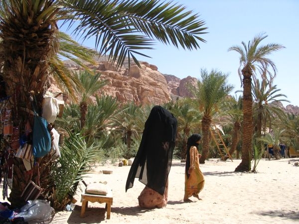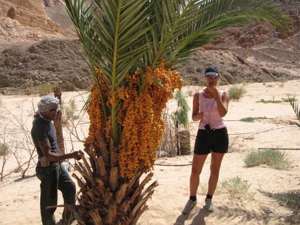 našim zrakům zelená oáza. Bílý písek, datlové palmy (datle jsme si z