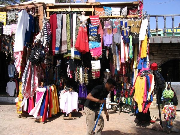 zahalené ženy prodávající náramky pro štěstí, rozkvetlé kytky a chýše z