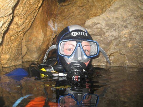 Keslu. Proplavání jeskyně k prvnímu sifonu. Viditenost pěkná, teplota