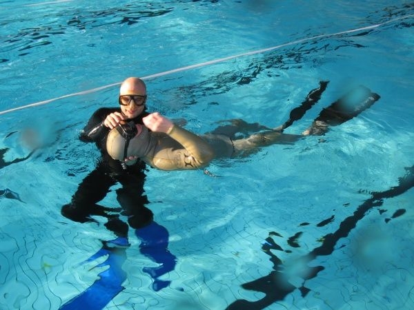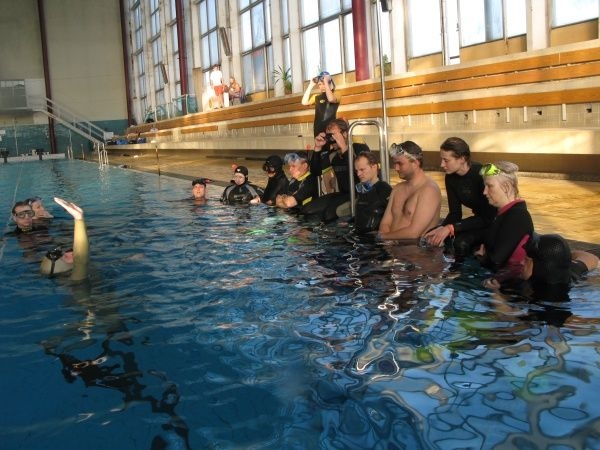 začnete v učebně, následuje však brzy první bazén, kde to všechno