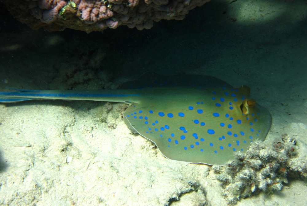 Hned ze břehu je tady asi 2 m plato a pak hned hloubka. Ve stejné skupině jako dopoledne jdeme dolů a je to ještě větší mazec než dopoledne. Ta rozlehlost a viditelnost… Pod námi plavou malincí potápěči a jejich bublinky nás masírují jako ve výřivce.