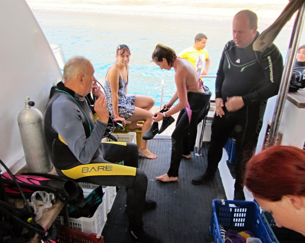 Oblékáme se a jdeme do vody. V naší skupině je PD, Homolkovi starší i mladší, Mira a já. Ve vodě jsme byli 50 minut, max. hloubka 19,2 m. Pod vodou si uvědomuji obrovskou velikost moře nad i pod sebou. Pozoruji malé i velké bublinky jak ucházejí z potápěčů a pomalu cestují na svobodu na vzduch.